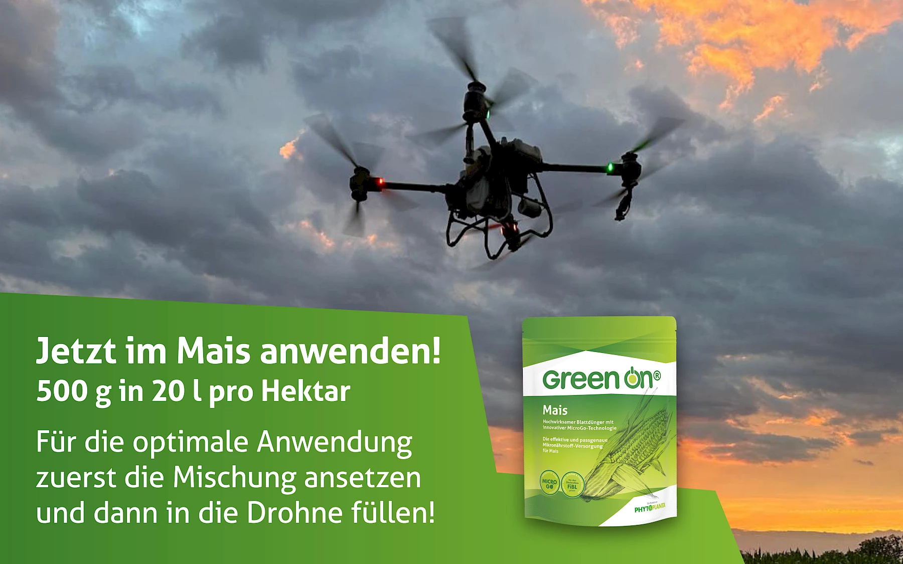 Mit Green On® Mais die Maisbestände passgenau mit Mikronährstoffen versorgen und die Pflanzen gleichzeitig für gute Stresstoleranz stärken, um den Mais nach den intensiven Niederschlägen und mit den hohen Temperaturen jetzt gut in die Ertragsbildung bringen! Mit der Drohne schonend und effizient ausbringen - einfach mehr erreichen!