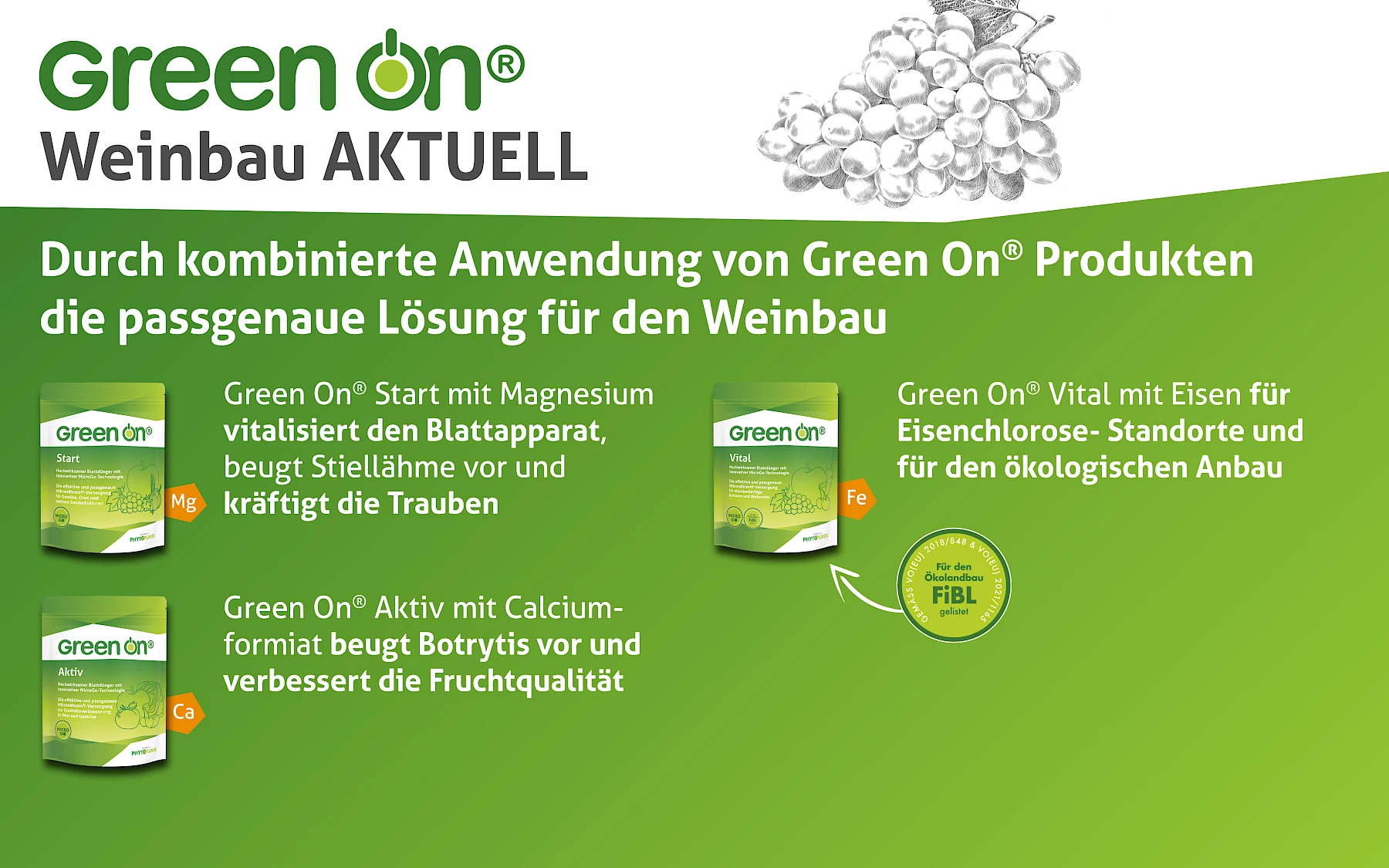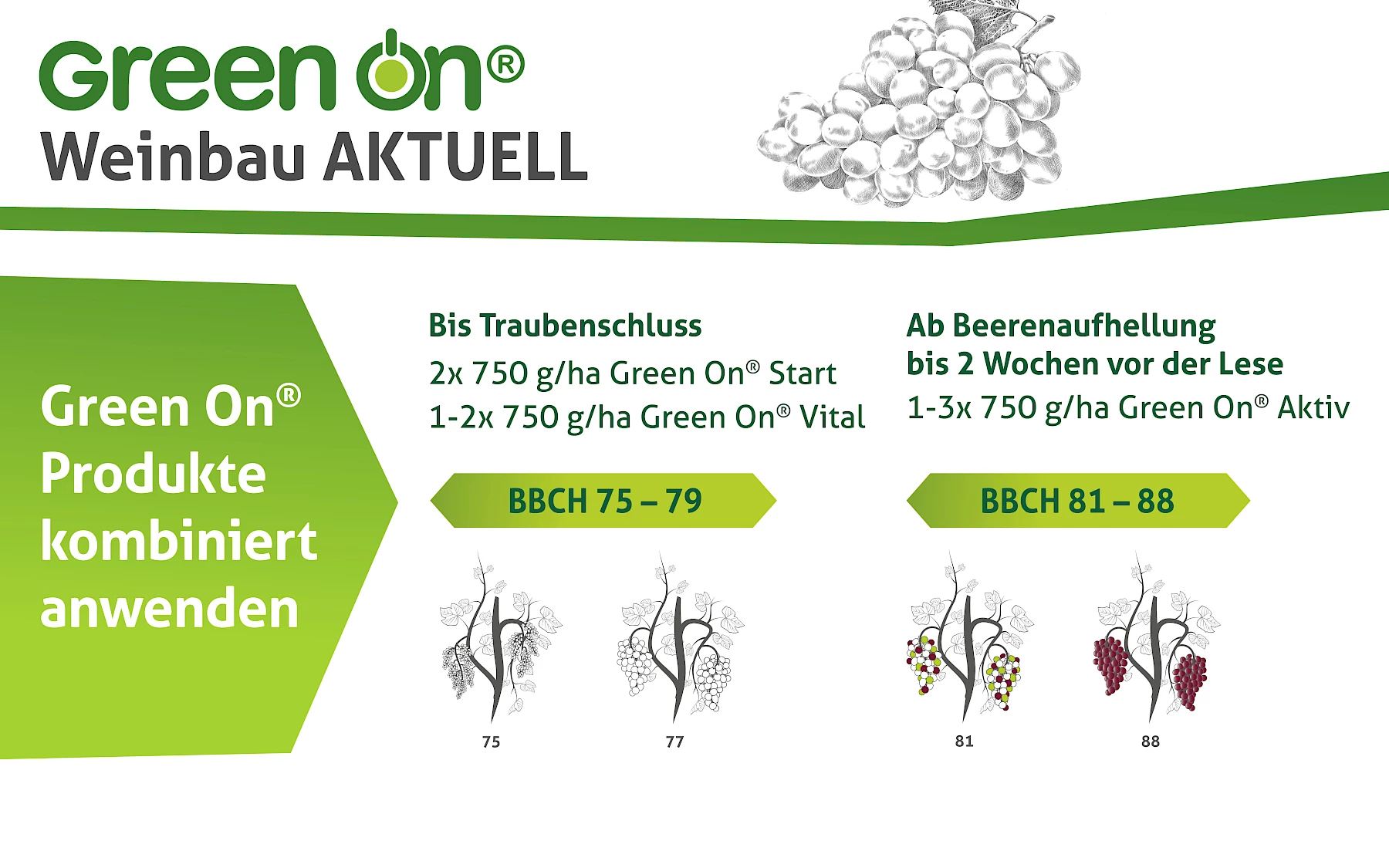 Green On® Start, Green On® Aktiv, Green On® Vital die sichere Lösung, mit der man mehr Traubenqualität bei der Lese erreicht.