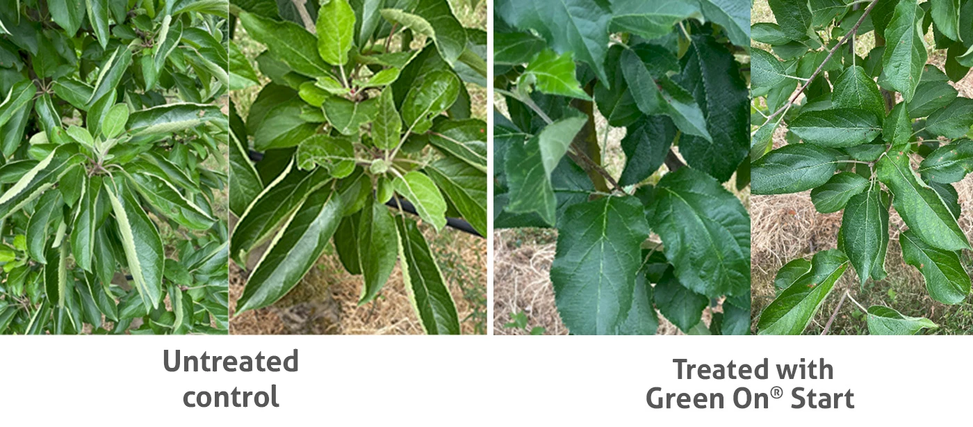 Field trial in apple, Braeburn variety, 2023; chlorophyll measurement 2 weeks after application of Green On® Start, photo taken at the onset of drought stress.