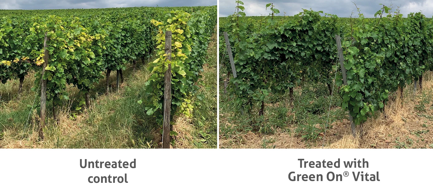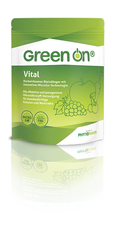 Green On® Vital is the efficient foliar fertilizer for locations with limited iron supply. In the case of iron deficiency due to high pH values in the soil, especially on calcareous soils (calcium chlorosis), as well as cold and wet soils (bad weather chlorosis), Green On® Vital provides targeted support for the vegetative growth of special crops right from the start. Green On® Vital provides the "extra portion" of iron to prevent leaf chlorosis due to iron deficiency at an early stage. In order to avoid a deficiency of other micronutrients induced by the increased iron supply, Green On® Vital also supplies zinc, manganese and copper for an optimally balanced micronutrient supply. Green On® Vital is approved in the FiBL list of inputs for organic farming.